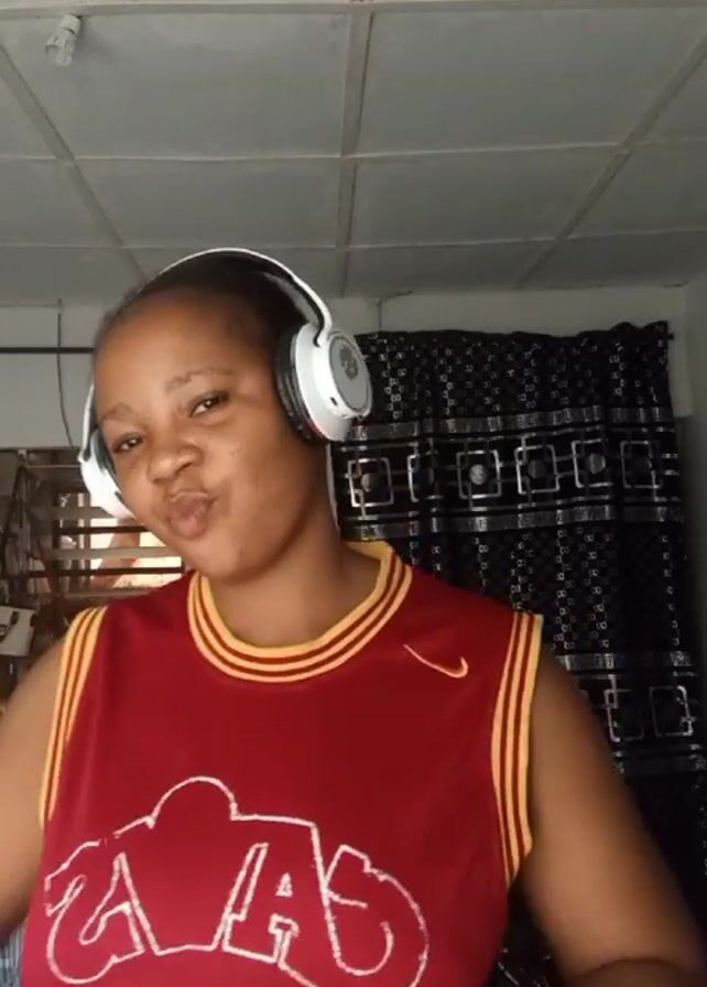A young woman is centered in the video frame. She is wearing a red and gold basketball jersey with a Nike logo. She also has white headphones on. She is in a room with a checkered ceiling and a decorative curtain visible in the background. She is facing the camera and moving her hands in a gesturing motion, seemingly in time with music.