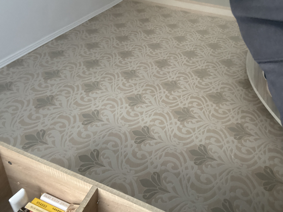 The scene depicts an interior room located in the city of Razgrad, Bulgaria. A wall, viewed from a slightly upward angle, is covered with textured wallpaper featuring a repeating damask-style pattern. The pattern consists of light cream or off-white stylized floral and scrollwork elements against a warm, light beige background, with some elements shaded in light grey or taupe. A white crown molding runs along the top of the wall, where it meets a white ceiling, visible in the upper right quadrant. In the upper left portion of the frame, a light-colored wooden bookshelf unit is partially visible, angled downwards. On its upper shelf, a small white rectangular electronic device is present next to several books with light yellow and white spines, featuring Cyrillic text, with partial titles such as "ИЗРАВЕН" and "СВЕТИ..." discernible. No individuals are fully visible; however, dark blue or black fabric, consistent with a garment worn by an individual (e.g., a sleeve or shoulder), occupies the lower right corner, partially obscuring a light-colored, curved piece of furniture, likely a headboard or chair back.