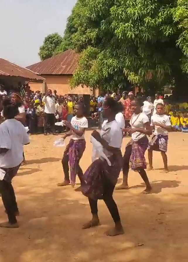 A group of young girls dance outdoors in a circle on a dirt field. They are wearing white t-shirts, purple patterned wraps, and black leggings. Some of them are holding small white cloths. A crowd of people, including children in yellow uniforms, are watching the performance. Several buildings with corrugated metal roofs are visible in the background, as well as a large tree. The sky is cloudy. The scene appears to be a school or community event.