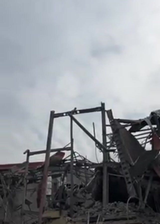 building that has been severely damaged, possibly by a bombing or shelling. The structure is mostly rubble and twisted metal, with only a few skeletal remains of the frame still standing. The sky is overcast, and the overall atmosphere is bleak. The camera angle looks up at the building, emphasizing the height of the destruction. A crane can be seen amidst the rubble.