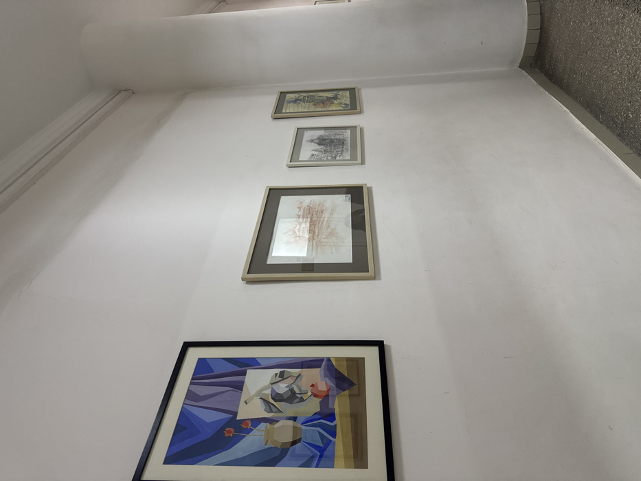 The image displays an interior hallway or gallery space within a building in Yerevan, Armenia. A series of five framed artworks are mounted on a white, painted wall extending from the foreground to a rounded architectural corner on the right. The first artwork on the far left is a large, vertically oriented piece framed in black with a light mat. It depicts a cubist-style still life featuring a brown vase with two orange flowers, a dark abstract object or figure on a lighter stand, and flowing blue and purple drapery. Below these elements is a horizontal yellow-brown surface. To its right is a horizontally oriented artwork in a light-colored frame with a mat. This piece is a sketch or drawing predominantly in reddish-brown lines, appearing abstract or depicting an urban landscape. The third artwork is a smaller, vertically oriented piece, also in a light-colored frame and mat, showcasing a monochrome architectural drawing, possibly a building facade or street scene. Adjacent to it, a fourth vertically oriented artwork, in a similar light-colored frame and mat, depicts a more colorful architectural scene featuring yellow and blue hues, potentially a tower or tall structure. A fifth framed artwork is partially visible on the far right, mostly obscured by the wall's curve. The white wall shows minor scuffs and texture variations. A narrow, light-colored trim runs along the top where the wall meets the ceiling. The floor, visible in the bottom right, is a dark, speckled terrazzo or concrete, bordered by a light grey baseboard. No individuals are present in the scene.