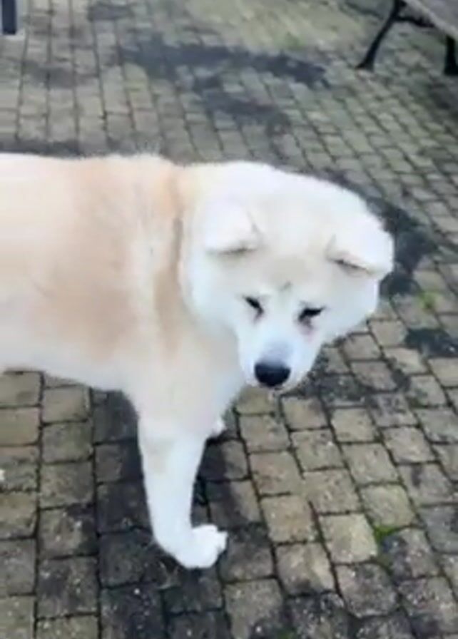 cream-colored Akita dog standing on a paved surface. The dog turns its head toward a person, then twists its body around to look behind it. The dog then begins to circle in place and chase its tail, almost tripping over its own feet. The paved surface appears to be a patio, with a metal bench and table visible in the background. The video is shot from a close distance, focusing on the dog's movements.