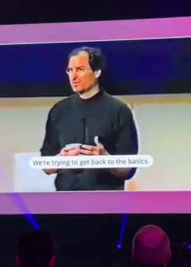 presentation featuring footage of Steve Jobs speaking at an event. Jobs, wearing a black turtleneck and jeans, is shown on a large screen, addressing the audience about getting back to basics and fundamental directions. Two people are visible in the foreground, seated and watching the presentation. The room appears to be an auditorium or conference hall, with stage lighting visible above.