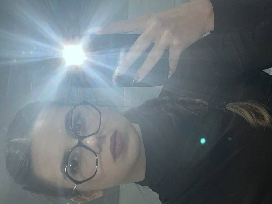 This image captures a mirror selfie taken indoors in Gramajdano, Bulgaria. A female individual, visible from the upper torso, is the central subject. She has dark brown hair styled in a single braid extending over her left shoulder. She wears hexagonal-shaped eyeglasses with dark frames and light-colored accents. Her lips are tinted a reddish-pink. She is dressed in a black, long-sleeved, high-necked top. Her right hand, with long, light-colored or iridescent fingernails, holds a dark-colored smartphone directly in front of her. The phone's flash is active, emitting a bright, star-shaped lens flare that dominates the upper right quadrant of the reflection. The background is an indistinct, blurred interior space. A small, bright blue-green light artifact is visible in the lower central area of the image.