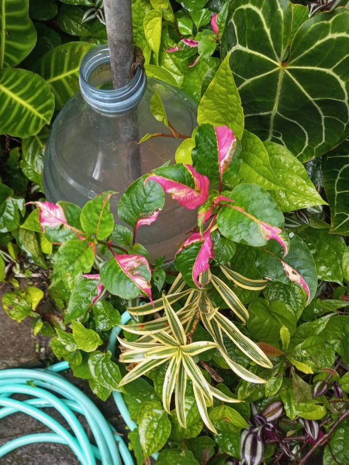 A lush garden scene features a clear plastic water bottle with a gray pole through its neck, encircled by a vibrant mix of plant life. The leaves exhibit various shades and patterns. Some are a striking green and pink combination, others striped green and yellow. Broad green leaves with distinct white veins are also present. A coiled, light blue hose lies in the lower left corner. The plants appear damp, suggesting recent rain or watering.