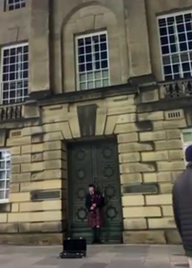 A medium, low-angle shot depicts a man playing bagpipes in front of a large stone building with multiple windows
