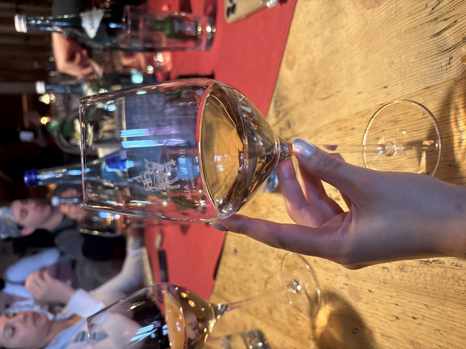 The image depicts an indoor scene at the Hospiz Alm in St. Christoph, Austria, focusing on a light-skinned hand holding a clear, stemmed wine glass filled with light rosé-colored liquid. The glass prominently displays the white, inverted logo "HOSPIZ ALM ST. CHRISTOPH". The hand exhibits light-colored manicured fingernails. The setting is a rustic wooden table partially covered by a red fabric runner. To the left, another wine glass, also containing liquid, is visible. In the blurred background, several individuals are seated around the table; a woman with dark hair and a light top is visible on the left, looking to her right, and a man with a head covering is seated behind her. The table also holds multiple additional blurred wine glasses, several water bottles (one with a blue cap, another with a partially visible 'MER...' label), a green bottle, and a partial view of a light-colored mobile phone on the right. Warm, diffused lighting illuminates the scene, creating reflections on the glassware.