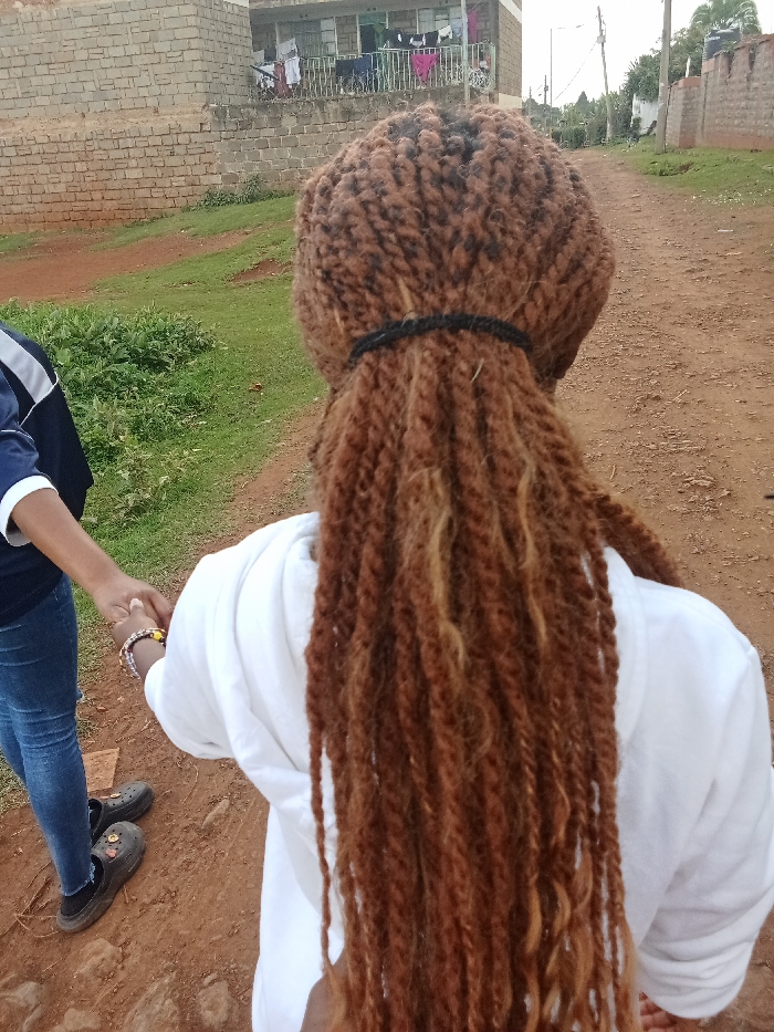 The image captures two individuals holding hands on a reddish-brown dirt path in Nyeri, Kenya. The primary subject is viewed from behind, featuring long, reddish-brown twisted dreadlocks or braids secured with a black hair tie, and wearing a white long-sleeved top. Their left wrist displays multiple beaded bracelets. To the left, a second person is partially visible, wearing a dark blue and white top, blue jeans, and black closed-toe shoes. This individual's right hand interlocks with the first person's left hand. The path is bordered by green vegetation and scattered stones. In the background, a two-story building constructed from light-colored stone or brick is visible, featuring a second-floor balcony with various items of clothing hanging to dry. The dirt path extends into the distance, lined with further vegetation, utility poles, and distant structures, including a dark water tank visible on a rooftop to the far right.