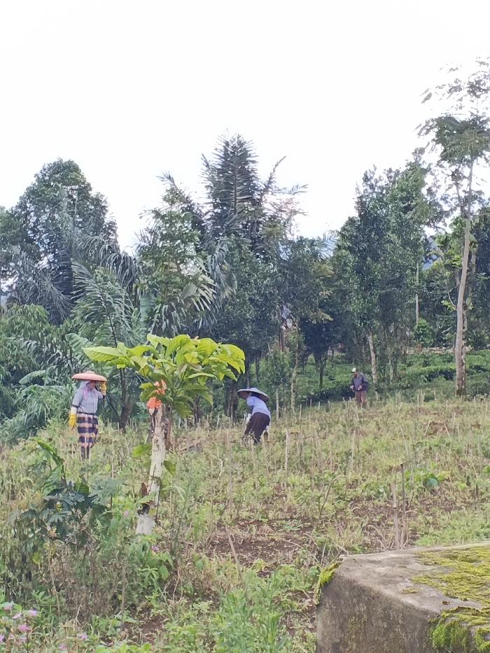 A hillside landscape is captured, featuring agricultural activity. Three figures are working in a field amidst scattered vegetation and tree stumps. The backdrop is dense with a variety of trees, creating a lush green environment. One worker wears a traditional wide-brimmed hat and yellow gloves, while another is shielded by an umbrella. A partially visible concrete structure covered in moss is located at the lower right of the image.