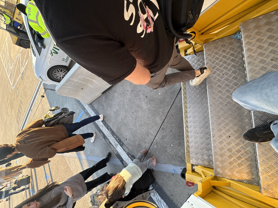 The image depicts an outdoor airport tarmac scene at Vienna International Airport (VIE) in Schwechat, Austria, viewed from a first-person perspective descending portable aircraft stairs. In the immediate foreground, the photographer's legs, clad in blue jeans and black sneakers, rest on the diamond-plate surface of the stairs. Directly below and to the right, another individual is partially visible, wearing a black t-shirt with a white graphic (partially obscured), grey trousers, and white sneakers, with their right foot on a lower step. On the grey concrete tarmac, a group of people is present. To the left, a female with long dark hair, wearing a grey long-sleeved top and black trousers, stands facing left. Adjacent to her, a young child with long brown hair, dressed in a light-colored long-sleeved top and grey pants, leans forward against a black rolling suitcase. Further from the stairs, a male with dark hair and a beard, wearing a brown oversized jacket and dark blue jeans, walks away from the aircraft, carrying a folded grey stroller in his right hand and another brown jacket over his left arm. Blurred figures, some with rolling luggage, are visible further in the background to the left. To the right, a grey concrete barrier separates the immediate pedestrian area from a vehicle lane. Behind this barrier, a white sedan is parked, featuring "VIE" and "30 4000" on its side. A person in a high-visibility yellow jacket with "VIE" on the back and a black beanie is seated in the driver's seat of this vehicle. A yellow airport ground service vehicle is partially visible further in the background to the right. The tarmac is marked with blue and white painted lines. The scene is brightly illuminated by natural sunlight, casting distinct shadows.