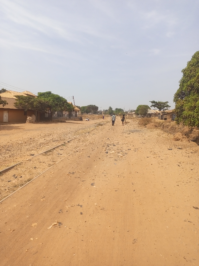 The image depicts an unpaved, reddish-brown dirt road in Sabon Tasha, Nigeria, under a hazy, light blue sky with scattered clouds