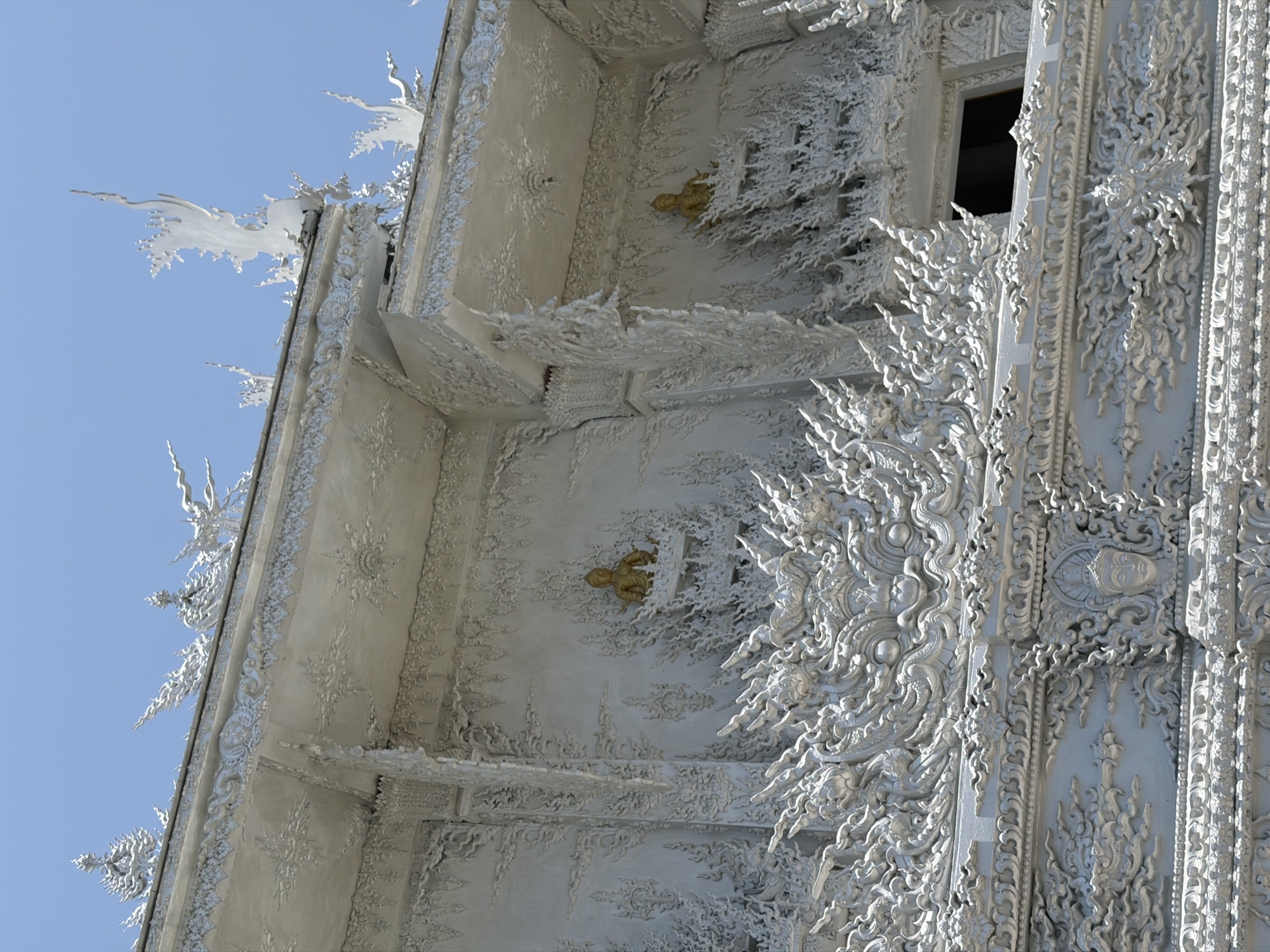 - "This image depicts an upward view of a section of a highly ornate, predominantly white temple facade under a clear blue sky, located in Thep Krasatti, Thailand" by FM-RjPGA3, licensed under CC BY 4.0