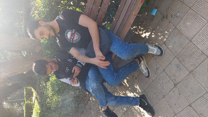 - "Two young adult males are seated on a wooden slatted park bench in Ash-Shaghour Municipality, Syria, under bright daylight" by FM-kqxKp1, licensed under CC BY 4.0
