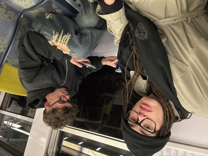 Two people sit together on a train. One wears glasses, a black jacket, and ripped jeans, looking at a phone. The other wears glasses, a black beanie, dreadlocks, a black jacket, and a tan trench coat. A Red Bull can is visible. The scene is indoors, with a window and other seats partially visible. The image appears to be taken at a slight angle.