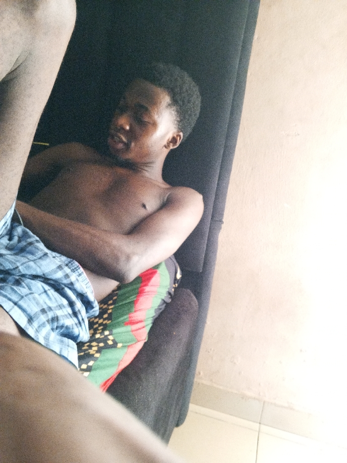 The image depicts an indoor scene in Lokoja, Nigeria. A dark-skinned male, appearing to be in his late teens or early twenties, with short, dark, curly hair, reclines on a dark-colored upholstered sofa. He is shirtless, wearing an inner garment with green, red, and black stripes and yellow/black patterned elements, overlaid by blue and white plaid shorts. His left arm is bent across his torso. His eyes are open, directed slightly upwards and to the left. The upper leg and thigh of another dark-skinned individual are visible in the foreground on the left, partially obscuring the primary subject. The background consists of a light-colored wall, with a brightly illuminated section on the right, and a light-tiled floor visible at the bottom right.