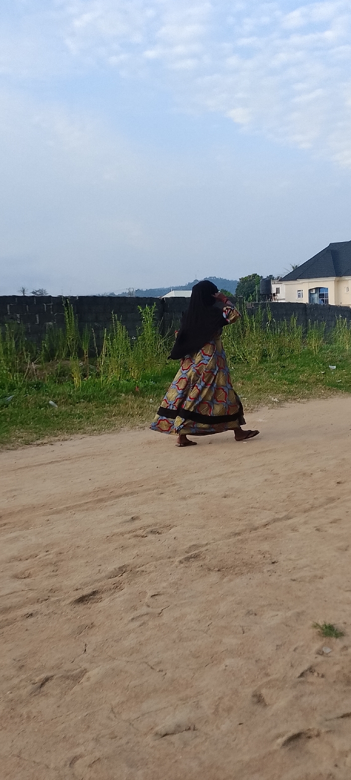 A woman in a patterned, ankle-length dress and dark head covering walks on a dirt road. She wears sandals and appears to be adjusting her head covering. Behind her, a black brick wall lines a grassy area, with a building visible further back. The sky is overcast and light. The road takes up most of the frame, leading the viewer's eye toward the woman and the background.