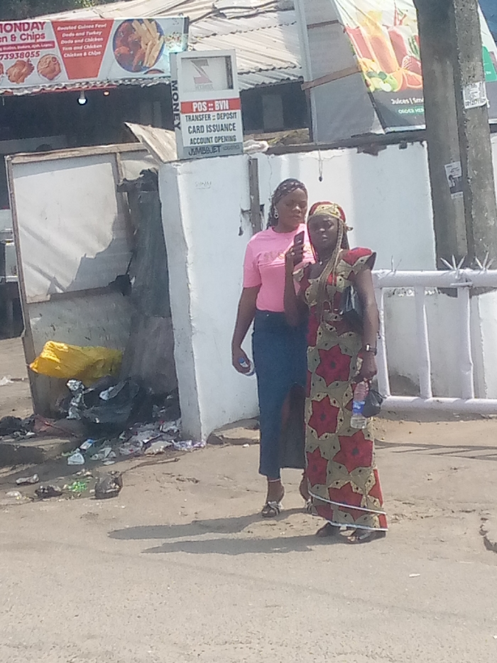 The image depicts an outdoor street scene in Iranla, Nigeria, under bright daylight with distinct shadows indicating strong overhead sunlight. Two adult females stand in the foreground on a dirt and asphalt surface littered with various debris, including plastic bags and wrappers. The woman on the left, with dark braided hair, wears a pink short-sleeved t-shirt, a long dark blue skirt with a thigh-high slit on her left side, and silver high-heeled sandals. She holds a red smartphone in her raised right hand, oriented as if capturing a photo or video to her right. The woman on the right, also with dark braided hair visible beneath a matching headwrap, wears a long, patterned dress with red, olive-green, and beige geometric star-like designs. She holds a clear plastic water bottle in her left hand and a dark handbag in her right hand. A white cable or cord is wrapped around her lower calves. In the background, from left to right: a low white concrete wall fronts a corrugated metal roof. Adjacent to this wall on the ground is a yellow plastic bag and substantial litter. Above the wall, a sign advertises "MONDAY Roasted Guinea Fowl Dodo and Turkey Yam and Chicken Chips." To its right, a vertical sign displays "MONEY" and a sign for financial services including "POS :: BVN," "TRANSFER :: DEPOSIT," "CARD ISSUANCE," and "ACCOUNT OPENING" by "JUMBOJET." Further to the right, behind the women, a white concrete barrier topped with pointed metal spikes is visible, and above it, a banner displays images of fruit and juice. A dark utility pole stands on the far right.
