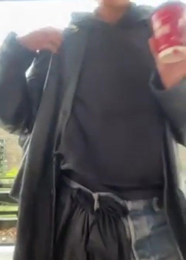 A woman stands on a train platform in overcast weather. She wears a black jacket, a gray hooded sweatshirt, blue jeans, and black boots. She is carrying a large black bag over her shoulder and holds a red paper cup in her hand. Her hair is pulled back into a messy bun. The background includes a brick wall covered with green vines and some train tracks. She opens her jacket, adjusts it, and takes a sip from her cup.