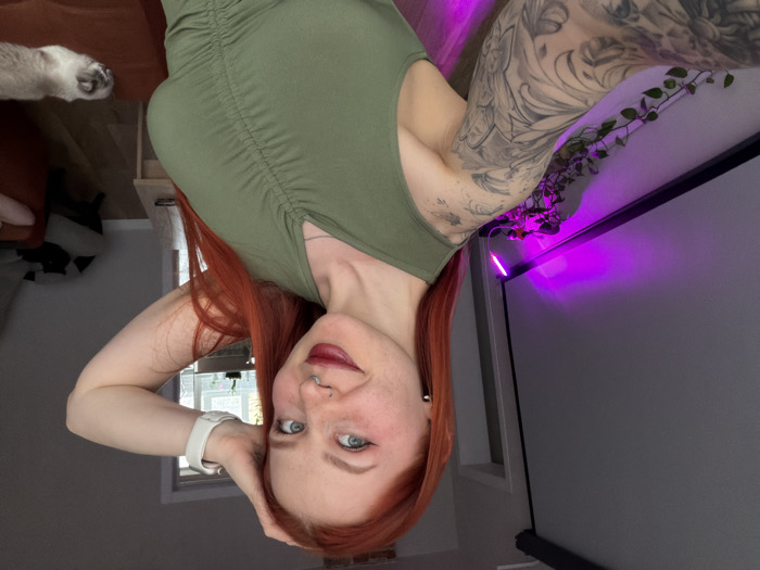 The scene is located in Rostov-on-Don, Russia. The image depicts an adult female subject taking a selfie indoors. She has fair skin, long red hair, blue eyes, and visible freckles. Her left arm, extensively tattooed with black and grey floral or ornamental designs, is extended forward, presumably holding the camera. Her right hand is raised, with fingers touching the side of her head. She is wearing an olive green sleeveless top with ruching down the front and a white smart watch on her left wrist. Facial features include a smile with visible front teeth, dark red lipstick, winged eyeliner, a silver-colored septum piercing, and a small silver stud earring in her left earlobe. The background to the left features a large grey projector screen mounted on a wall. Below it, a bright purple LED strip light illuminates a potted plant with trailing green leaves. To the right, a doorway is visible, and further back, a window with potted plants on the sill. The room has light-colored walls and a wooden floor. In the lower right corner, a light-colored cat with darker points, resembling a Ragdoll breed, rests on a brown upholstered surface, possibly a sofa armrest or ottoman. A dark armchair is partially visible in the mid-ground.