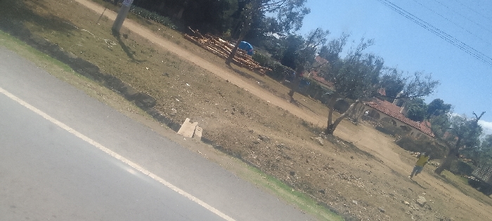 An angled outdoor photograph depicts a roadside scene in Viwandani ward, Kenya, under a clear blue sky. In the foreground, a grey paved road with a solid white edge line runs diagonally from the bottom left to the upper right. Immediately adjacent to the road is a narrow strip of green grass, transitioning into dry, brown earth with scattered sparse vegetation. In the midground, a utility pole stands vertically on the left, casting a long shadow across the ground. A dirt path runs parallel to the paved road, further back. To the left of this dirt path, a large pile of stacked timber logs or cut wood is visible, partially obscured by trees. A blue tarp or similar object is discernible near the base of the woodpile. Concrete blocks or debris are present on the ground near the paved road. The background features several trees with varying foliage density. A building with a reddish-brown tiled roof and multiple arched openings is partially visible behind the trees on the right side. A lone individual, possibly male, wearing a yellow shirt and dark trousers, is walking on the dirt path on the right side of the frame, facing away from the camera. Overhead, against the clear blue sky, multiple thin lines consistent with power or communication cables are visible. The scene is illuminated by bright daylight, casting distinct shadows.