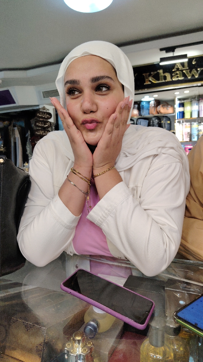 The image displays an indoor scene within a commercial establishment, likely a shop or boutique, located in the city of Barza Municipality, Syria. A female individual, appearing to be in her 20s or 30s, is positioned centrally behind a transparent glass counter. She has light to medium skin, dark eyebrows, and brown eyes. Her head is covered by a white headscarf (hijab). She is wearing a white collared jacket over a pink top. Both hands are raised to her cheeks, applying pressure that creates a pouting expression with puckered lips. Her fingernails are long and light-colored. On her left wrist, she wears a silver-colored chain bracelet with a charm and two gold-colored chain bracelets. Her right wrist displays one gold-colored chain bracelet. On the glass counter in front of her, a purple-cased smartphone with a dark screen is visible, along with reflections of a silver-colored perfume bottle shaped like a revolver cylinder, a yellowish liquid perfume bottle, and a partial view of a second smartphone with a blue screen and green case. The background indicates a retail environment. To the left of the subject, a dark handbag and clothing items on hangers are visible. A dark rectangular sign with gold Arabic script is mounted on a wall. To the right, shelves are stocked with various packaged products, including bottles and what appear to be bags or luggage. A gold sign partially displaying "Al Khaw" is also visible in the upper right background. An overhead white circular light fixture and an air conditioning vent are visible. A second individual, wearing a light brown garment, is partially visible on the far right edge of the frame.