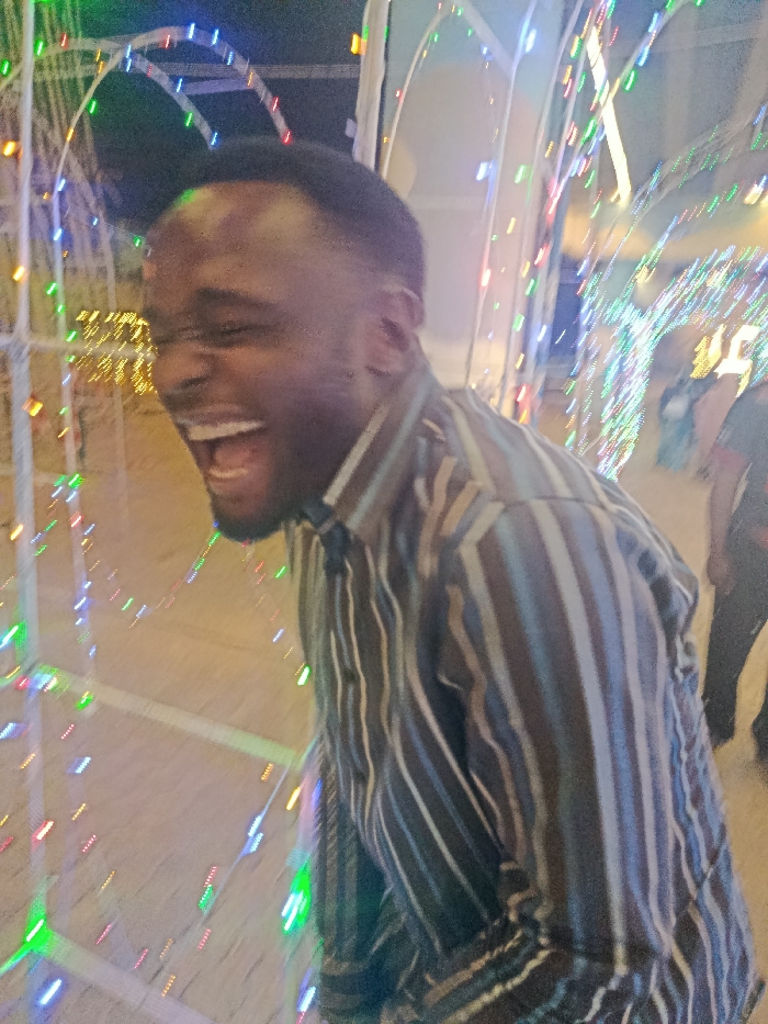 A person is captured in a moment of intense laughter, head thrown back, mouth open wide. They wear a striped long-sleeved shirt in shades of blue, grey, and white. Behind them, a pathway adorned with rows of illuminated arches creates a festive atmosphere with blurred lights. Part of another person is visible on the right. The image has a candid, joyful quality, emphasizing the person's amusement.