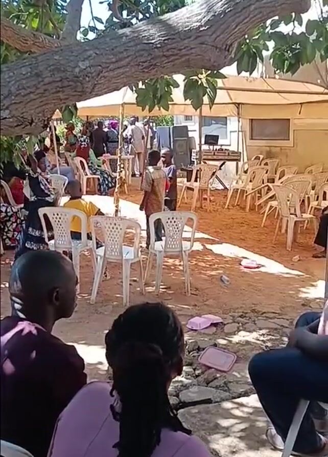 The scene takes place outdoors under the shade of a large tree. The focal point is a gathering of people, most seated on white plastic chairs under a canopy. Some people are standing around the periphery. A small stage area is set up, with a keyboard and speakers visible. Two children are dancing and moving around in the open space between the seated crowd and the stage. In the foreground, three people are seated on a low structure, facing the gathering. The person in the middle has dark hair styled in long braids. Discarded styrofoam food containers are scattered on the ground. The overall atmosphere appears lively and celebratory. The scene is captured with a slightly shaky hand-held camera, providing a ground-level perspective.