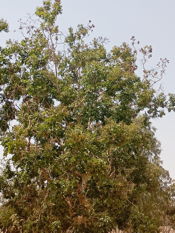 The image displays a large, leafy tree situated outdoors in Bukuru, Nigeria, set against a clear, pale blue sky. The tree features a dense canopy of green foliage, with leaves varying in shade and concentration. Prominent light-colored, sinuous branches are visible throughout the upper and central portions of the canopy. Small clusters of dark reddish-brown structures, consistent with developing fruits or seed pods, are present on some of the upper branches. The lower portion of the tree's trunk is partially visible, exhibiting a light tan coloration. Hints of additional green vegetation are discernible in the lower background to the right and left. No human subjects, animals, or discernible man-made structures are present within the frame. The scene is static and appears to be captured during daylight hours.