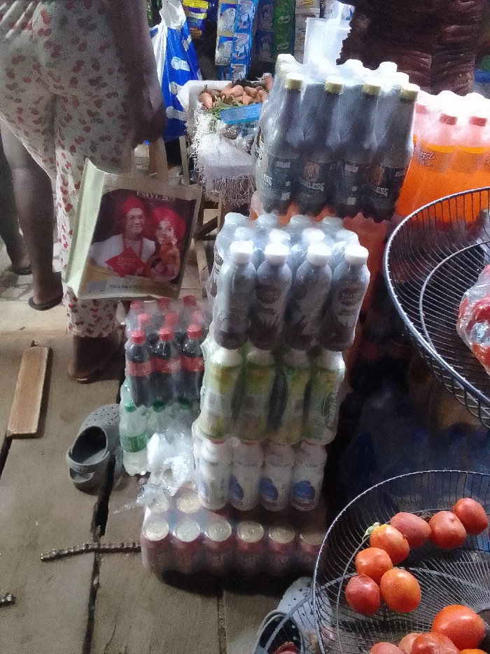 street vendor's stall. Stacks of bottled drinks like Coke, Sprite, and chocolate milk tower beside orange soda. A metal basket holds tomatoes, while another contains various root vegetables. A woman in cherry-print pants stands by, carrying a tote bag with a portrait. A grey sandal sits next to a wooden plank, adding to the clutter of the outdoor marketplace.