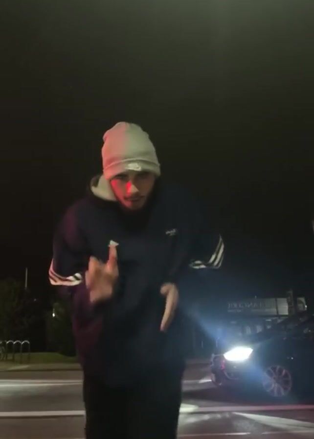 A young man wearing a light grey beanie, a blue Adidas tracksuit jacket, and black pants is dancing on a street at night. His hands move rhythmically. The background features a dark sky, streetlights, a road with white lines, parked bicycles, a building with illuminated signage, and a black car with its headlights on. The overall environment is urban and dark.