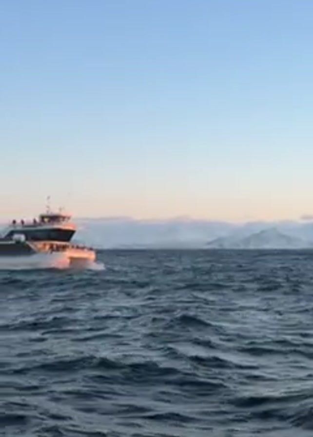 large white passenger ferry moving quickly through dark, choppy water toward the right side of the frame. The boat appears to be filled with people, mainly standing on the upper decks. In the background, snow-capped mountains are visible under a clear blue sky that fades to a pale orange on the horizon. The water creates a distinct wake behind the boat as it moves.