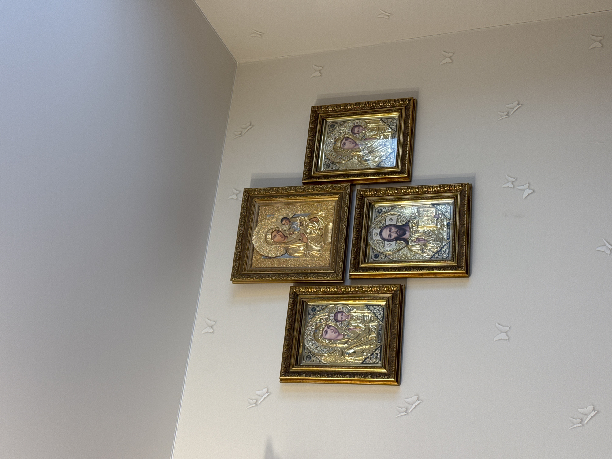 The scene depicts an interior wall within a residence in Dolgoprudny, Russia. Five framed Eastern Orthodox icons are mounted on a light-colored, possibly off-white, wall featuring a subtle, repeating butterfly relief pattern. The wall connects to a plain white ceiling via a narrow border trim. The icons are arranged in a cruciform configuration: a larger, central rectangular icon of the Virgin Mary holding the Christ Child is positioned highest. This central icon is flanked horizontally by two smaller rectangular icons, each depicting the Virgin Mary embracing the Christ Child. A fourth rectangular icon, portraying Jesus Christ with a beard, holding a book, and gesturing a blessing, is centered directly below the top icon. All five icons are encased in ornate, golden-colored frames, with the icon images themselves featuring detailed gold and silver-toned rizas and visible Cyrillic inscriptions. The environment is illuminated by ambient interior light.