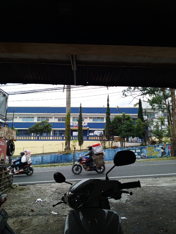 The image captures a street view from under a dark corrugated metal overhang. In the immediate foreground, the handlebars and front section of a dark-colored scooter are partially visible. The ground below appears coarse and scattered with debris. Across an asphalt road, a multi-story building with a blue lower facade and white upper levels forms the background. Visible text on the building's facade, partially obscured by trees, includes "S.M.K." and "TAMPI," indicating an Indonesian vocational high school. A low, blue and yellow painted wall runs along the roadside, featuring graffiti-style text that includes "ANALISIS SENI...TERANG." Several tall, slender evergreen trees and a palm tree trunk are positioned between the wall and the building. The street accommodates two motorcycles traveling from left to right. On the left, a light-colored scooter carries a driver wearing a light-colored helmet and a passenger holding a light-colored bundle. To its right, a dark-colored motorcycle is heavily laden with cargo, including a large rectangular box, a red rolled item secured on top, and a lower sack. The motorcycle's operator wears a dark helmet. On the far left, a metal sign for "SPARE PARTS MOBILE SERVICE MOTOR" and a hanging tire are partially visible, suggesting a repair business. The sky above is overcast, and power lines traverse the upper portion of the scene. Based on the visible Indonesian text, the location is in Indonesia, not Chennai, India, as implied by the prompt.