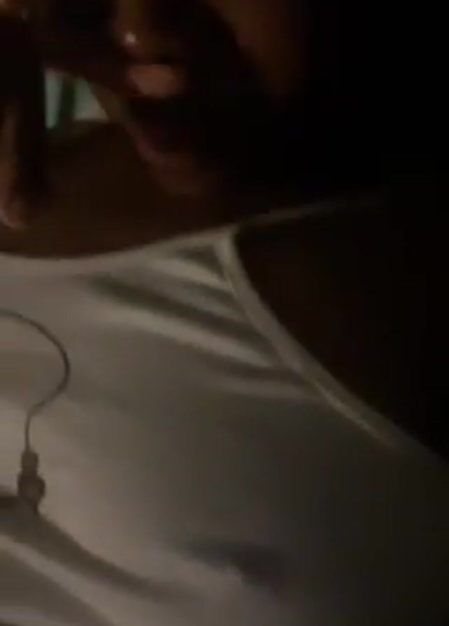 A person with dark skin and dark hair is partially visible. They are wearing a white tank top with a beaded design on it. The person's face is partially in the frame and they are pursing their lips and sticking their tongue out slightly. The background is dark.