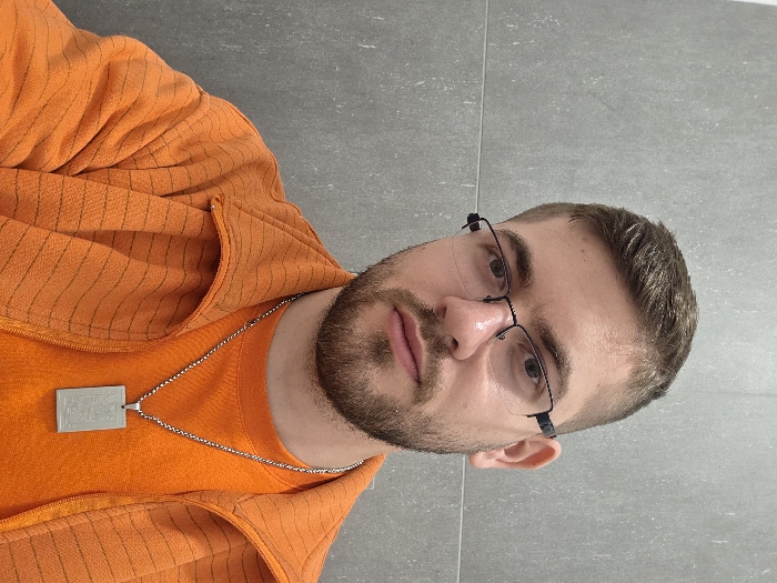 A male subject is depicted from the chest up, centered against a plain light grey wall. He possesses short, dark brown hair and a neatly trimmed beard and mustache. The subject wears dark-framed eyeglasses. He is dressed in an orange long-sleeved shirt, layered with an unzipped orange fleece jacket featuring subtle horizontal darker textured lines. A silver-colored chain necklace adorns his neck, suspending a rectangular silver-colored pendant with an etched design. The subject's gaze is directed towards the camera. The background provides no discernable features to identify a specific location within Plovdiv, Bulgaria, or any other city; it consists solely of an indoor-appearing grey wall with a faint horizontal seam.