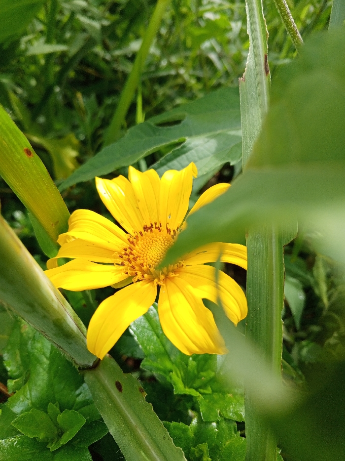 A vibrant yellow flower, resembling a daisy, is partially obscured by green foliage. The flower's center is a dense cluster of brown-tipped structures, likely the pistils and stamens. Long, slender green leaves and stems surround the flower, adding to the impression of a wild, overgrown garden setting. The composition suggests a candid moment captured amidst nature's abundance.