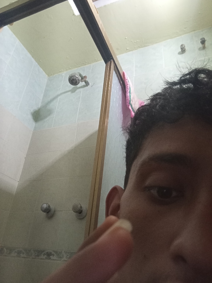 A person's face fills the right side of the frame, focusing on their right eye and ear. They hold a small, white object close to the camera. The background is a bathroom. Light green ceiling, tiled walls, and a shower head are visible in the upper left. Two towel hooks are seen on the lower left wall. A partially visible towel hangs on the door frame of the shower.