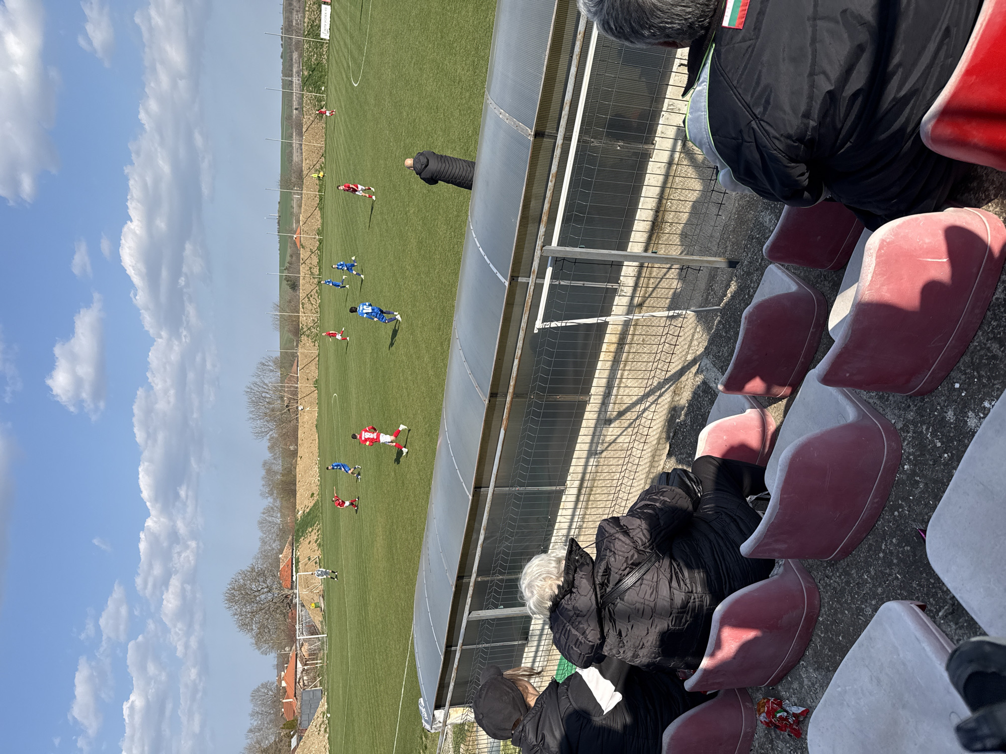 The image displays an outdoor football (soccer) match taking place at a local stadium in Dobrich, Bulgaria, under a partly cloudy sky