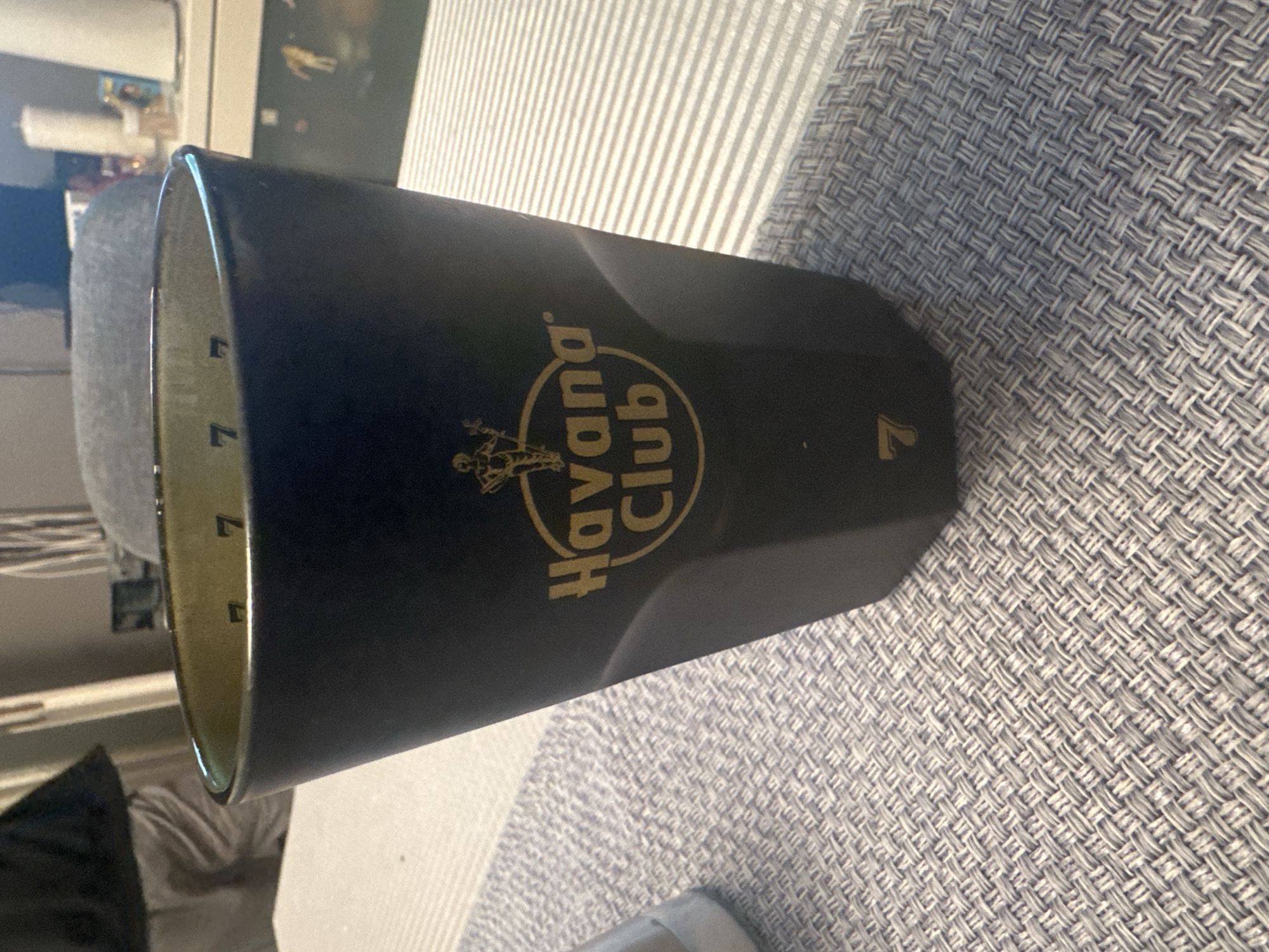 A dark-colored cylindrical glass with the Havana Club logo and "7" printed on its side is positioned on a surface that transitions from a striped pattern to a gray-blue woven texture. The glass is mostly black, with gold lettering and markings. The "7" appears on the right side of the glass. The interior edge of the glass shows markings that appear to be numeric. A chair is visible behind the glass. The image is taken at an angle. The location in Munich, Germany, is not determinable from the image.