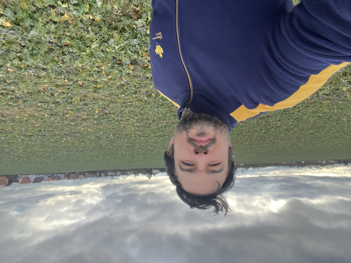 A male subject is depicted in a selfie, positioned in an open, cultivated field. He has dark hair, a beard, and a mustache; his hair on top is windswept upwards. He is wearing a dark blue fleece jacket with yellow stripes across the shoulders and upper sleeves. An emblem featuring a yellow maple leaf with the text "Canadian Sports" is embroidered on the left chest. The subject looks directly at the camera with a neutral expression. The background consists of an expansive field covered with green leafy plants. In the far distance, a line of houses with light-colored roofs is visible, indicating a residential area bordering the field. The sky is heavily overcast with dark gray clouds, though some brighter areas are visible where light penetrates the cloud cover. The scene takes place in an agricultural area on the periphery of a settlement in Unknown, Unknown.