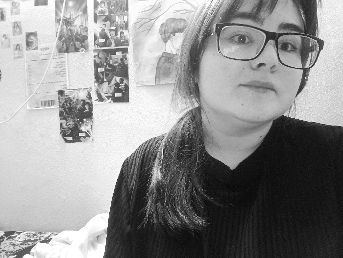 A person with bangs and glasses looks directly at the camera. The individual has fair skin and dark clothing. Their hair is pulled back into a low ponytail. Behind them, a light-colored wall is adorned with assorted photographs, drawings, and a receipt. A bed with a patterned coverlet and white linens is visible in the lower left corner. The image is black and white.