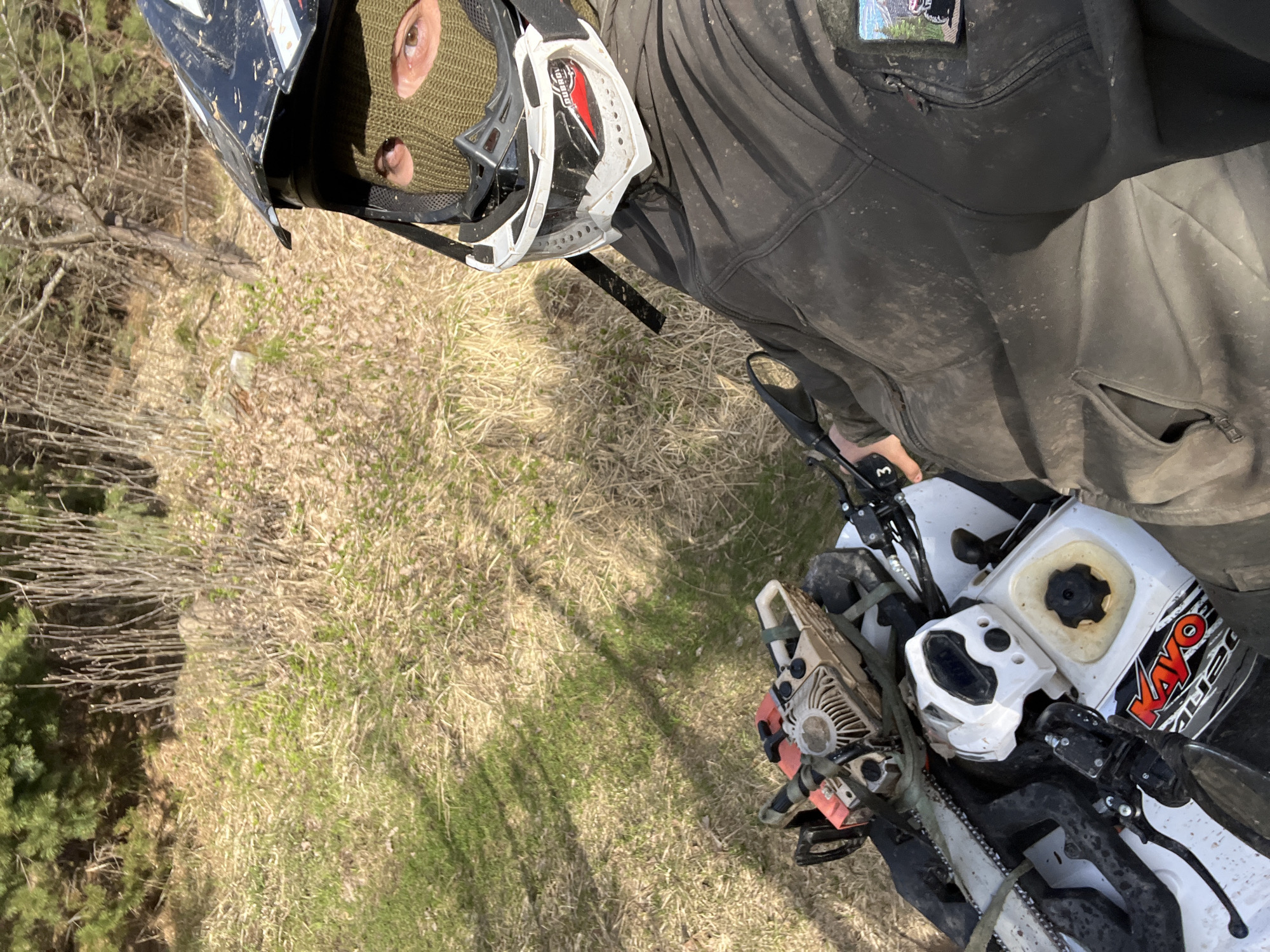 person wearing a balaclava, goggles, and a helmet, standing next to a dirt bike with a chainsaw strapped to it