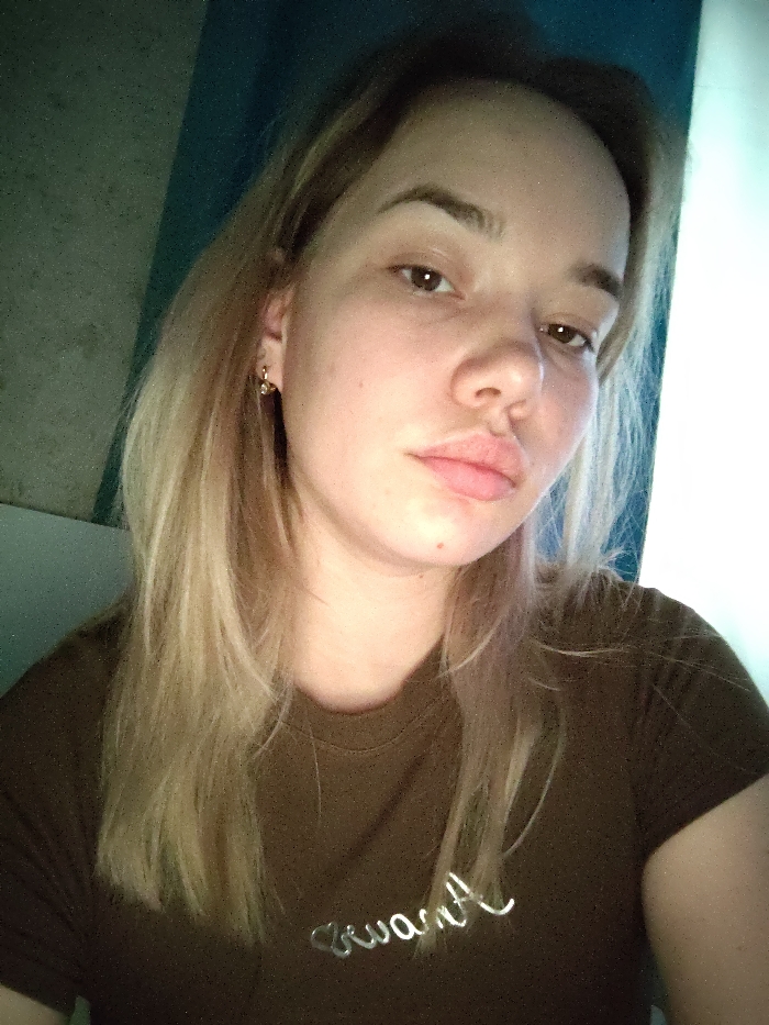 A young woman with fair skin and blonde hair looks directly at the camera. She has light eyebrows and dark eyes. Her lips are full and slightly parted. She wears a brown t-shirt with a silver-colored inscription on the front. The woman has an earring in her left ear. A blurry blue and white background is visible. The image appears to be taken in indoor lighting.