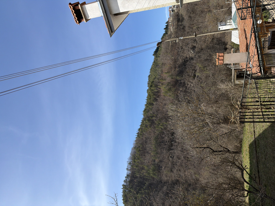 The image displays an outdoor, daytime scene in Taran, Bulgaria. The upper portion consists of a clear, bright blue sky with faint, wispy white clouds. Three parallel overhead wires traverse diagonally from the upper right toward the mid-left. A large, steep hillside, primarily covered in bare deciduous trees and shrubs, dominates the background and midground. The upper slopes of this hill are densely forested with dark green coniferous trees. In the distance, on the upper right slope, several small residential structures with light-colored walls and red tile roofs are visible. In the foreground, a patch of green grass is present on the lower left. Several leafless deciduous trees with dark, gnarled branches are scattered across the lower midground. A dark, wrought-iron railing or fence occupies the lower right portion of the frame. To the immediate right, part of a light-colored building with a terracotta tile roof and a prominent, light-colored chimney topped with red tiles is visible. Below this, partially obscured by the railing, is another building section with a terracotta tile roof and an ornate dark metal balcony railing. A wooden utility pole stands vertically in the mid-right, supporting a horizontal wire extending leftward and connecting to the visible overhead lines. No people, specific actions, or interactions are depicted.