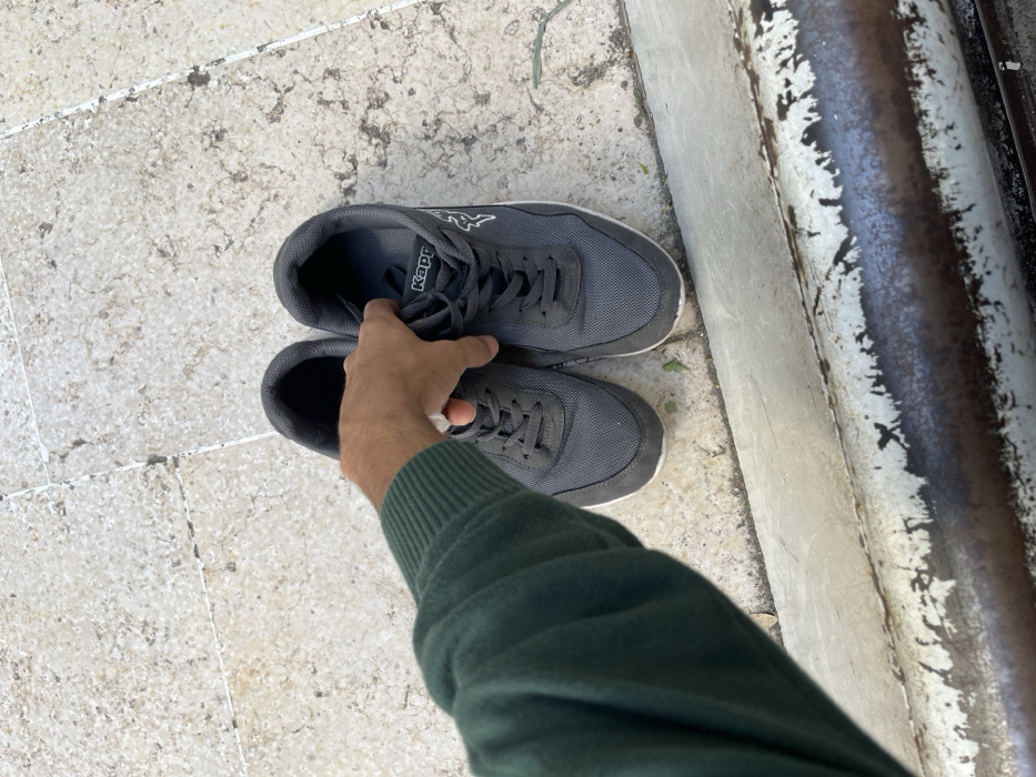 - "The scene, located in As-Salihiya Municipality, Syria, depicts a close-up, downward view of a person's right hand interacting with a pair of dark grey athletic shoes" by FM-WnN6r1, licensed under CC BY 4.0