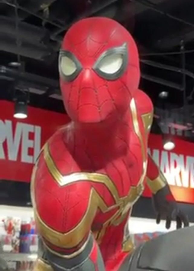 life-size Spider-Man figure in a store. The figure is in a red and gold suit, and is kneeling on a rocky base. The camera pans down the figure, showing the detail of the costume. The background of the shot shows a Marvel store display. There is music playing in the background.