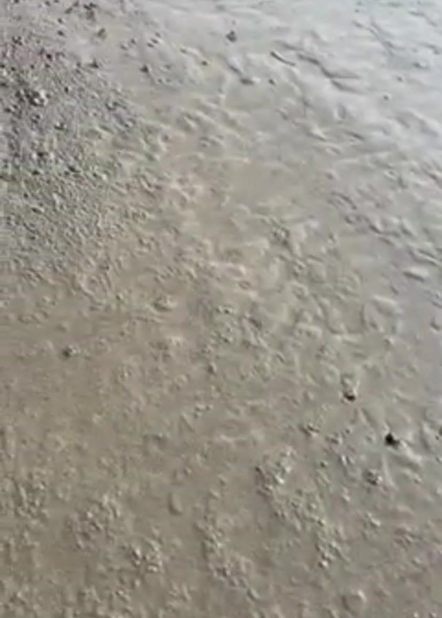 close-up view of a muddy, sandy shore. The ground is mostly grey with small indentations and marks across the surface. The texture appears wet and slightly reflective. There are tiny pebbles and possible debris scattered throughout the area. The video is relatively still.