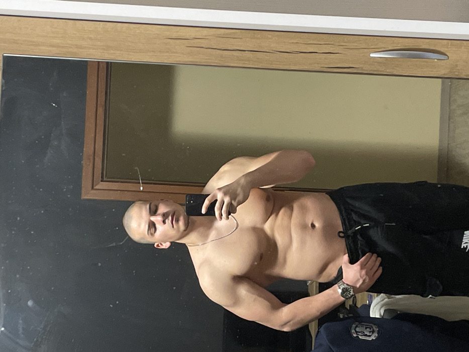 The image depicts an adult male taking a mirror selfie indoors. The specific location in Burgas, Bulgaria, cannot be determined from the visual evidence. The subject is a shirtless male with a muscular build and a closely shaven head. He is wearing a thin silver-colored chain necklace, a silver-colored watch on his left wrist, and black sweatpants with a drawstring and a reversed "NIKE" logo visible on the left leg due to the mirror's reflection. His eyes are partially closed or directed downwards. He holds a black smartphone in his right hand, positioned to capture his reflection, while his left hand rests on the waistband of his sweatpants. The environment is an indoor setting, likely a private residence. The large rectangular mirror, which serves as the primary framing element, appears somewhat dusty or smudged. Reflected behind the subject on the left is a dark, possibly black or dark grey, wall. To the subject's left, a blue garment with a white emblem is visible, resting on a surface alongside a white cloth or towel. Reflected on the right side of the mirror is a light beige or pale yellow wall, with a brown wooden door frame outlining a dark brown door. The mirror itself has a white frame with a light wood grain accent strip on its right side, which also includes a silver-colored handle, suggesting it might be part of a closet or cabinet door.
