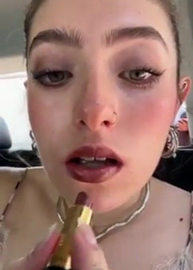A close-up video features a young woman applying dark lipstick. She has fair skin, brown hair pulled back, visible eye makeup and blush, a nose ring, and multiple necklaces and earrings. The lipstick tube is black with a gold top and reads "300 Coffee Bean." Behind her, blurry figures of people are visible, suggesting she might be in a car.