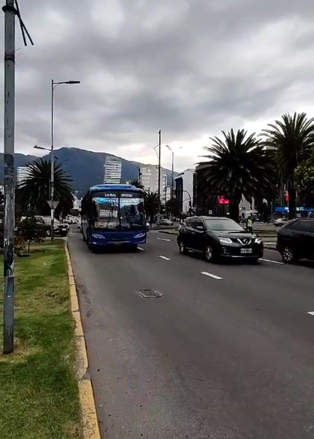 blue bus driving on a city street on an overcast day. The bus is labeled with various route destinations and the name "CAMAL". It is moving from right to left in the frame. There is a grassy shoulder on the left side of the road and a yellow taxi driving on the right side. In the background, there are buildings, palm trees, and a mountain range. The sky is cloudy.